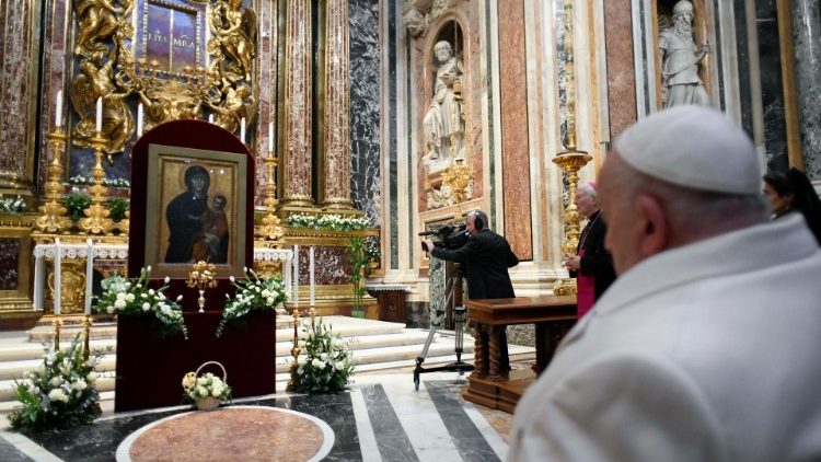 O Papa Francisco em oração diante do ícone da Salus Populi Romani (Vatican Media)