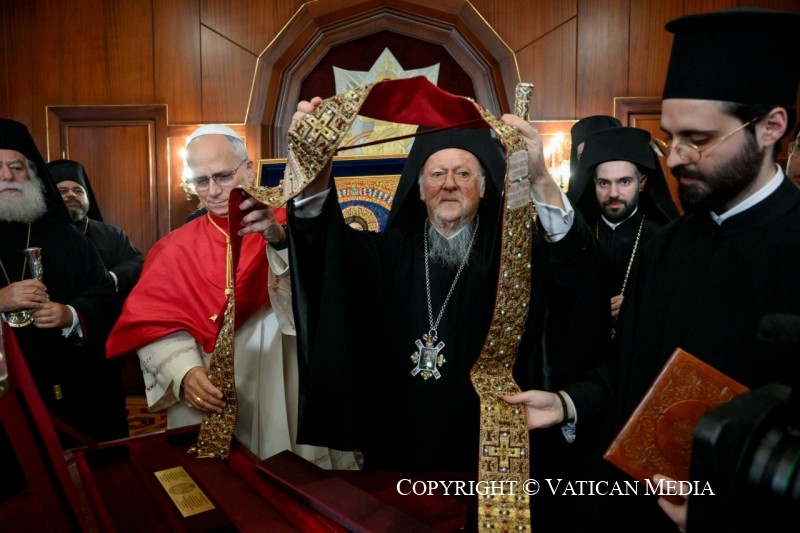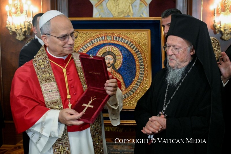 Caros Amigos, ainda no dia 29 de novembro de 2025 em Istambul, o Santo Padre encontrou-se, no Palácio Patriarcal, co sua Santidade Bartolomeu I, onde assinaram uma Declaração Conjunta e trocaram presentes.