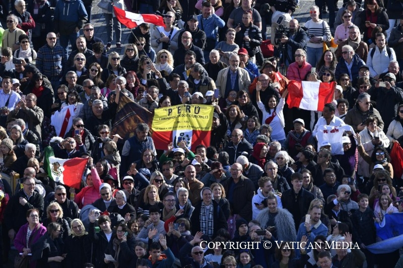 Saúdo com carinho todos vós, romanos e peregrinos. Saúdo todos os que vieram de outras partes do mundo, em particular os fiéis peruanos de Pisco, Cusco e Lima; os polacos, recordando também o Dia de oração e apoio material à Igreja do Leste; e também o grupo de estudantes portugueses.