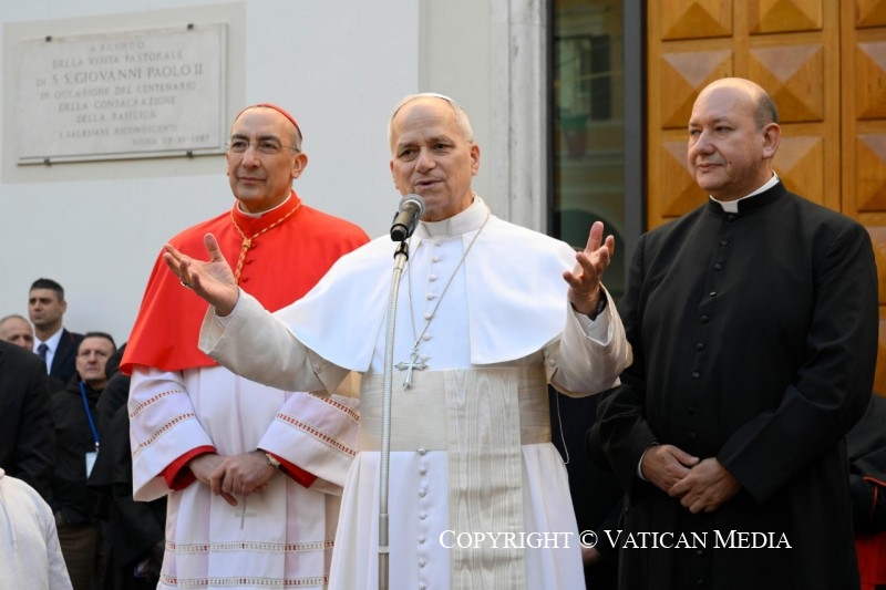 Saúdo também a comunidade dos Salesianos e das Salesianas que estão aqui presentes. Pensemos na história desta paróquia, começando com Dom Bosco, com os Salesianos, e o meu predecessor que também se chamava Leão, Leão XIII. Vivemos uma história que não é apenas do passado. Hoje fazemos história porque ainda hoje queremos viver esta belíssima tradição de serviço, de caridade, de trabalho com os jovens. Que bonito ver todas estas crianças aqui na frente! Uma salva de palmas para elas! Vivemos a alegria da vida: como é belo estar vivos, ter este dom da vida que o Senhor nos dá. Muitas, muitas felicidades! Bom domingo, boa celebração!