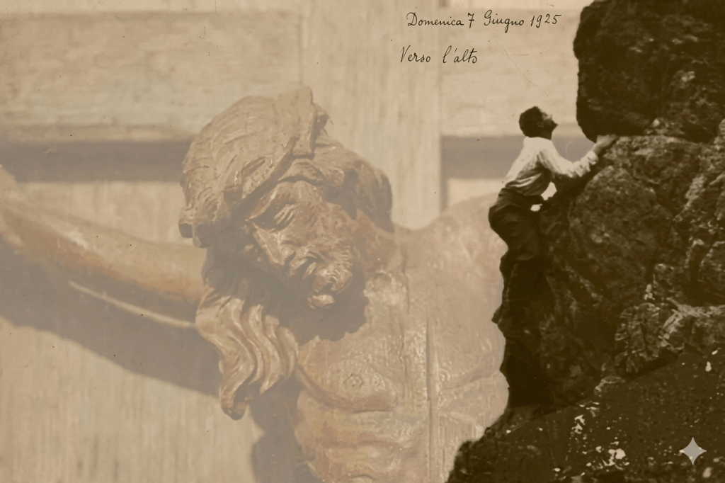 Essa imagem mostra Pier Giorgio Frassati escalando uma montanha 27 dias antes de sua morte. Na própria fotografia ele escreveu a expressão “Verso l’alto” (“Para o alto”), que se tornou o lema espiritual ligado ao seu nome.