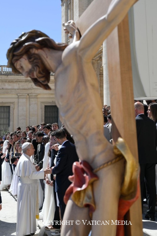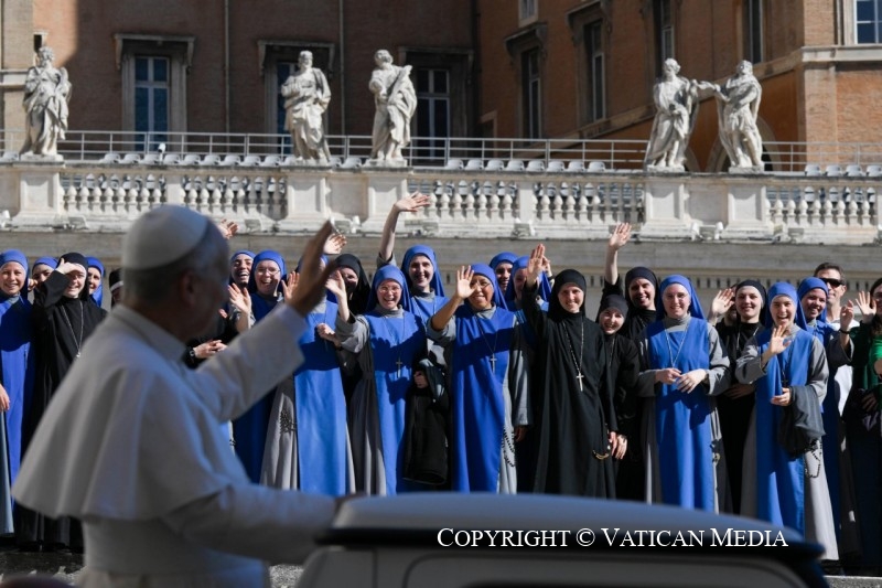 Conformando-se a este estilo de vida, as pessoas consagradas dão testemunho da vocação universal à santidade de toda a Igreja, sob a forma de um seguimento radical. Os conselhos evangélicos manifestam a plena participação na vida de Cristo, até à cruz: é precisamente pelo sacrifício do Crucificado que todos somos redimidos e santificados! Contemplando este acontecimento, sabemos que não existe experiência humana que Deus não redima: até o sofrimento, vivido em união com a paixão do Senhor, se torna caminho de santidade. Assim, a graça que converte e transforma a vida fortalece-nos em todas as provações, indicando-nos como meta não um ideal distante, mas o encontro com Deus, que se fez homem por amor. A Virgem Maria, santíssima Mãe do Verbo encarnado, apoie e ampare sempre o nosso caminho!