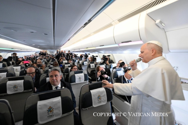 Gostaria de dizer já uma palavra. Esta viagem, que é muito especial por várias razões, deveria ter sido a primeira do pontificado. Já no mês de maio do ano passado, eu tinha dito: como primeira viagem, gostaria de fazer uma visita à África. Outros sugeriram imediatamente a Argélia – por causa de Santo Agostinho, como sabeis – e, realmente, estou muito contente por visitar novamente a terra dele. Santo Agostinho constitui, além disso, uma ponte muito importante no diálogo inter-religioso. Ele é muito amado na sua terra, como veremos. Assim, a oportunidade de visitar os locais da vida deste santo, onde ele foi bispo na cidade de Hipona – hoje Annaba – é verdadeiramente uma bênção para mim, pessoalmente, mas creio que também para a Igreja e para o mundo, porque devemos procurar sempre pontes para construir a paz e a reconciliação. Por isso, esta viagem representa efetivamente uma oportunidade muito preciosa para continuarmos com a mesma voz, com a mesma mensagem que pretendemos transmitir: promover a paz, a reconciliação, o respeito e a consideração por todos os povos. Sejam todos bem-vindos! Estou contente por vos saudar! Boa viagem e obrigado pelo serviço que prestais a todos. Obrigado!
