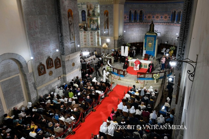 Sinal disso, como nos recordou o senhor Cardeal, é esta mesma basílica, símbolo de uma Igreja de pedras vivas, na qual, sob o manto de Nossa Senhora de África, se constrói a comunhão entre cristãos e muçulmanos. Aqui, o amor materno de Lalla Meryem acolhe todos como filhos, cada um rico na sua diversidade, unidos pela mesma aspiração à dignidade, ao amor, à justiça e à paz. Filhos desejosos de caminhar juntos, de viver, rezar, trabalhar e sonhar, porque a fé não isola, mas abre, une, mas não confunde, aproxima sem uniformizar e faz crescer uma verdadeira fraternidade, como nos disse Monia, e como testemunhou Rakel, partilhando a sua experiência na Tlemcen Fellowship. Num mundo onde as divisões e as guerras semeiam dor e morte entre as nações, nas comunidades e até mesmo nas famílias, o vosso viver unidos e em paz é um grande sinal. Unidos, difundis a fraternidade, inspirando nos que vos rodeiam desejos e sentimentos de comunhão e reconciliação, com uma mensagem tanto mais forte e clara quanto testemunhada na simplicidade e na humildade.