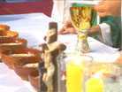 ![]() | HÓSTIA: Pão Eucarístico. A palavra significa “vítima que será” sacrificada. “E, tomando um pão, tendo dado graças, o partiu e lhes deu, dizendo: Isto é o meu corpo oferecido por vós; fazei isto em memória de mim.” Corpo de Cristo. | ![]() | VINHO: É vinho puro de uva. O vinho se converte no verdadeiro Sangue do Senhor, vivo e ressuscitado. |