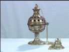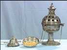 ![]() | INCENSO: Resina de aroma suave. Produz uma fumaça que sobe aos céus, simbolizando as nossas preces e orações à Deus. | ![]() | TURÍBULO: Recipiente de metal usado para queimar o incenso. |